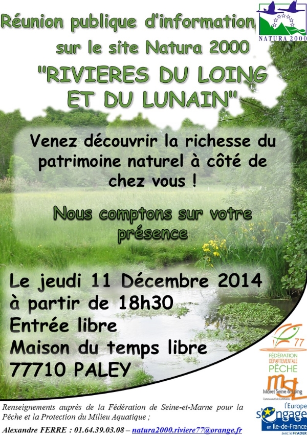 C’est à toutes ces questions, et d’autres encore, que la Fédération de Seine-et-Marne pour la Pêche et la Protection du Milieu Aquatique répondra lors de réunions publiques d’information sur le site Natura 2000 des « Rivières du Loing et du Lunain ». Ces réunions, à destination des propriétaires riverains des deux rivières, permettront à tout un chacun de s’informer sur le site, ses enjeux, son patrimoine naturel.