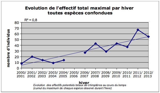 Les effectifs totaux de chauves-souris sont en progression quasi constante depuis le début des suivis. En effet, moins de dix individus étaient dénombrés la première année de comptage (hiver 2000-2001), tandis qu'un potentiel de 67 individus (somme des maximum de chaque espèce sur l'hiver) ont été observés à l’hiver 2011-2012. L’augmentation est particulièrement importante entre les hivers 2010-2011 et 2011-2012, principalement en raison de la forte augmentation des effectifs de Grand Murin et de Murin de Natterer par rapport aux hivers précédents.