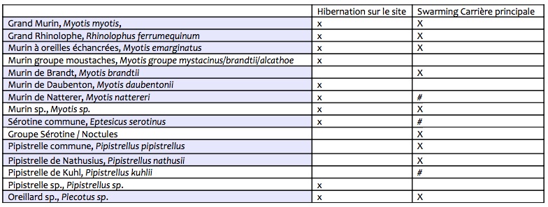 Les inventaires en période hivernale ont permis d'observer un total de neuf espèces ou groupes d’espèces de chiroptères depuis le début des comptages au sein de la carrière (2000-2001).