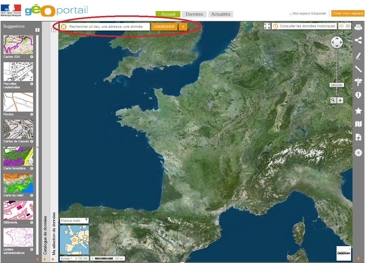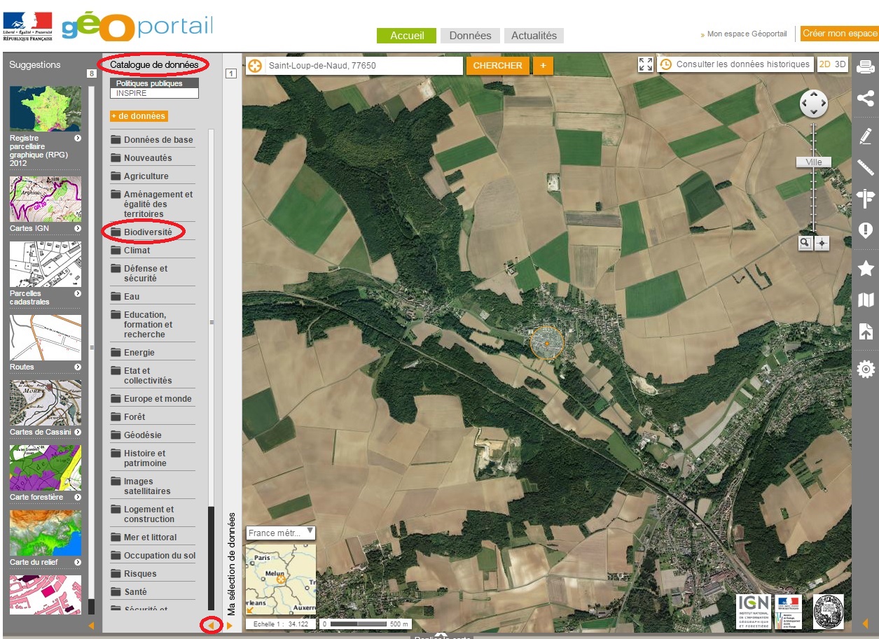 5) Si le fond de carte en photographies aériennes ne vous convient pas, vous pouvez choisir un fond en carte IGN dans l'onglet vertical "Catalogue de données" en bas à gauche.